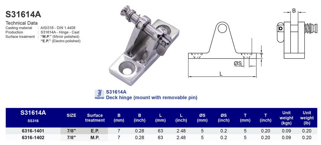 | SS316 | SIZE | Surface treatment | B (inch) | L (inch) | ØS (inch) | T (inch) | Unit weight (lb) |